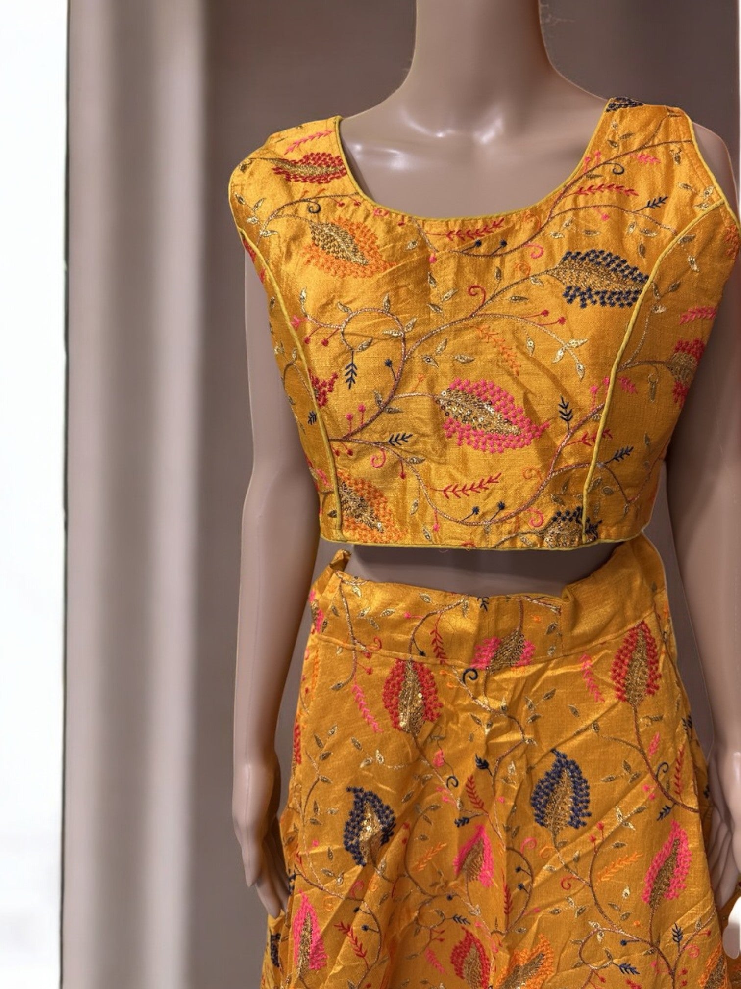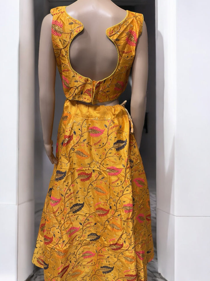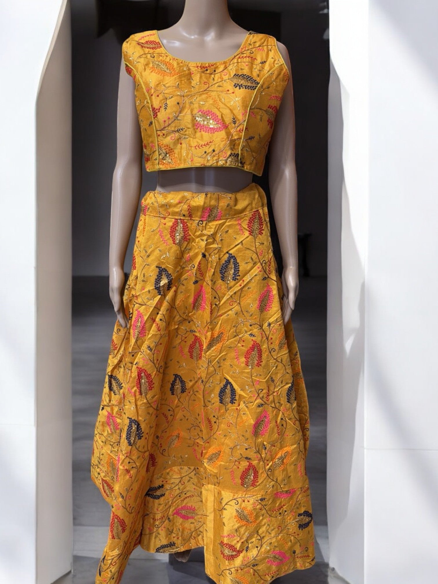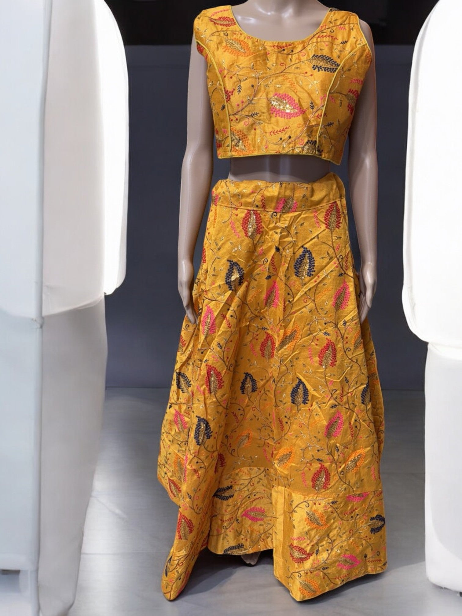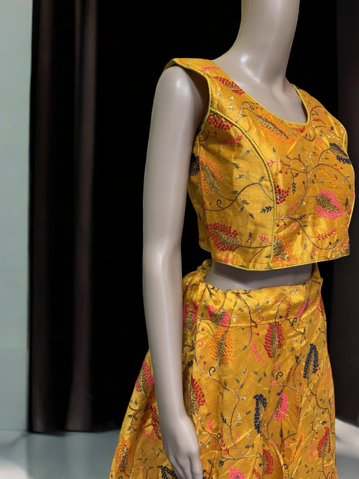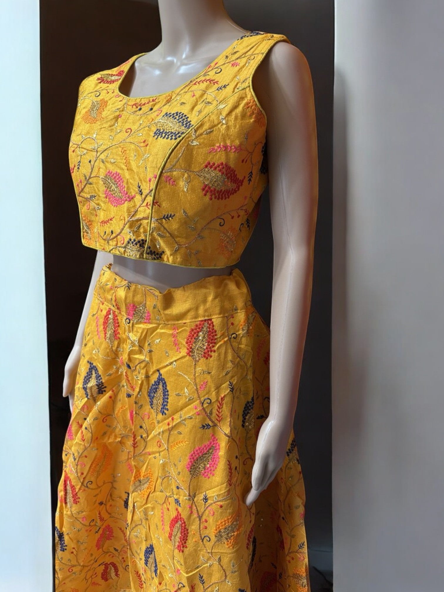 K11 - Mustard Yellow Embroidered Lehenga Choli Set – Sleeveless Crop Top & Flared Skirt