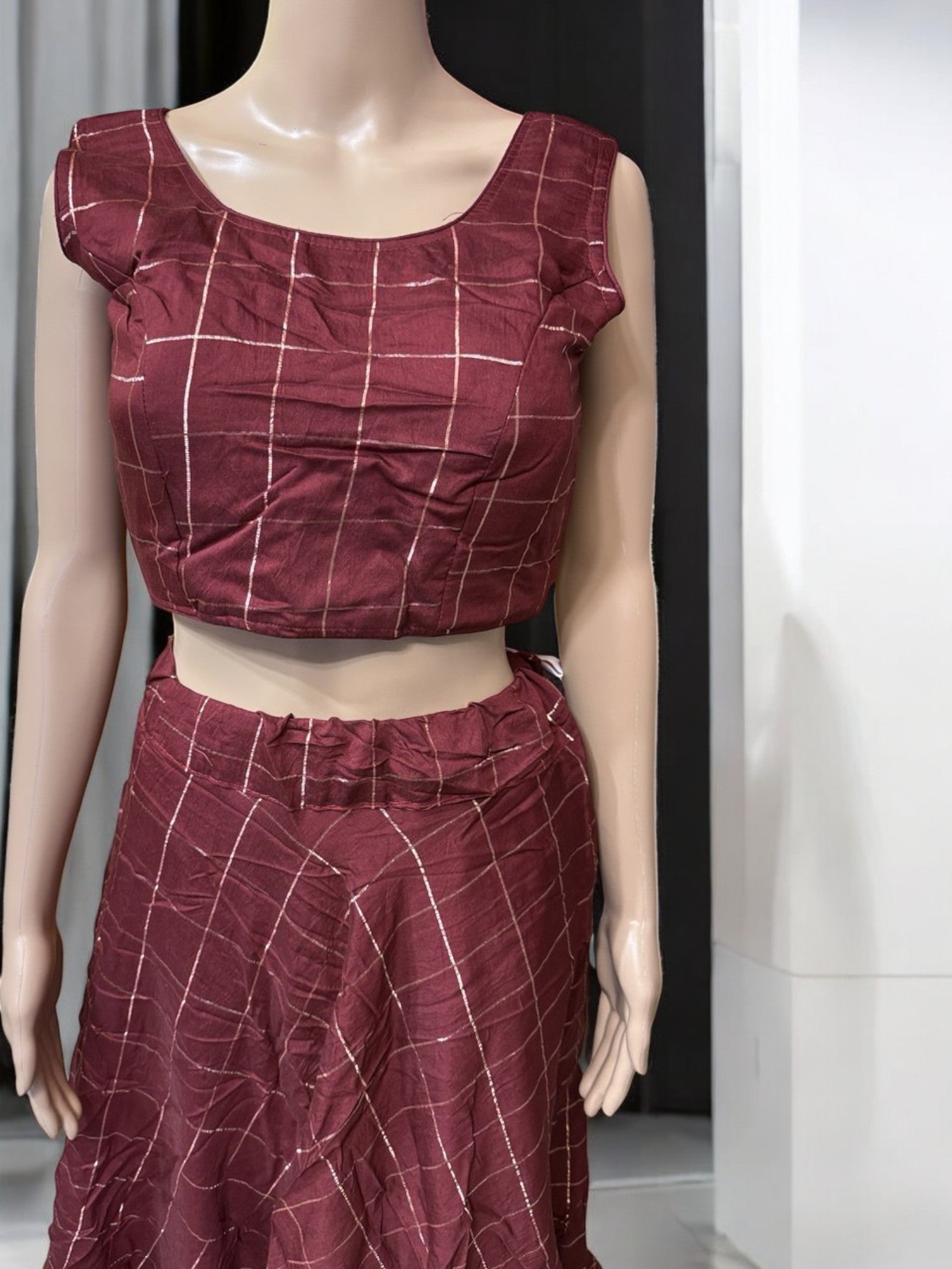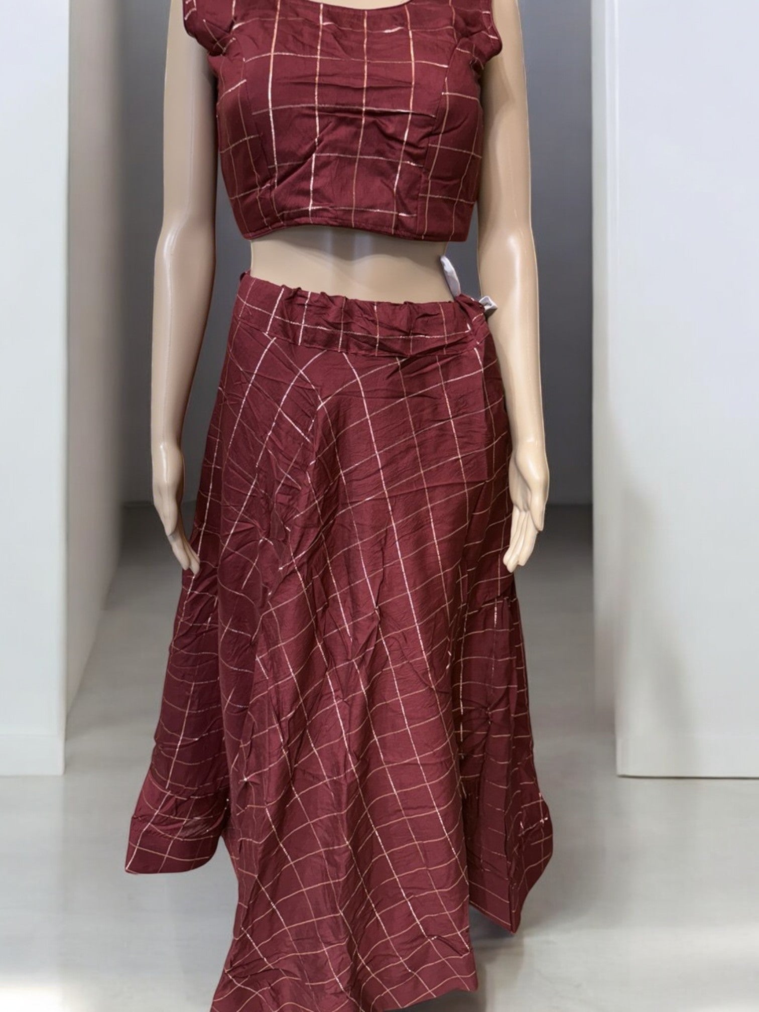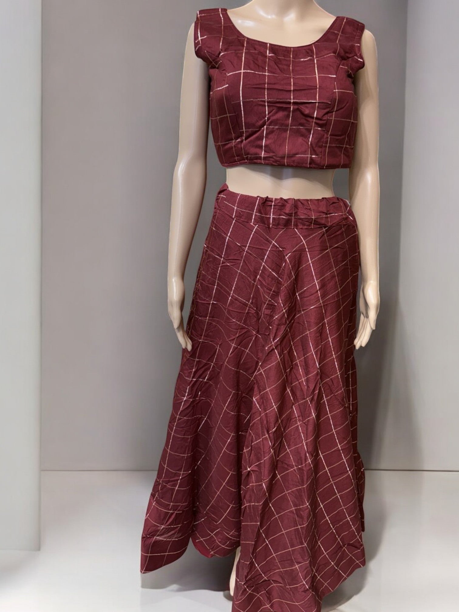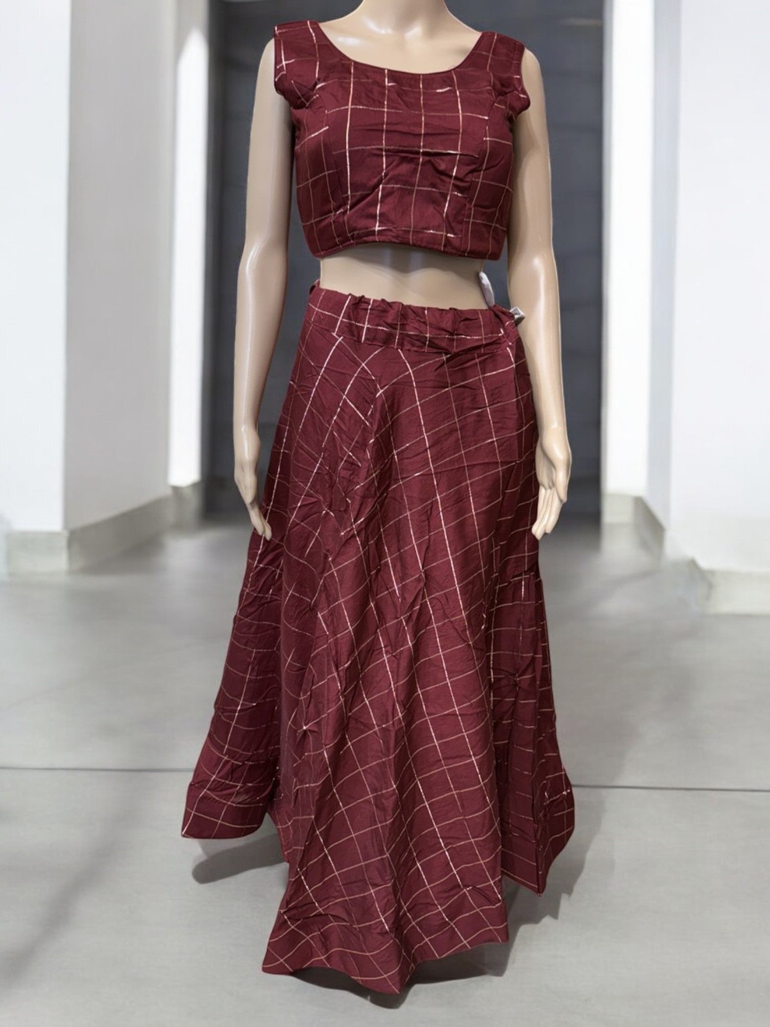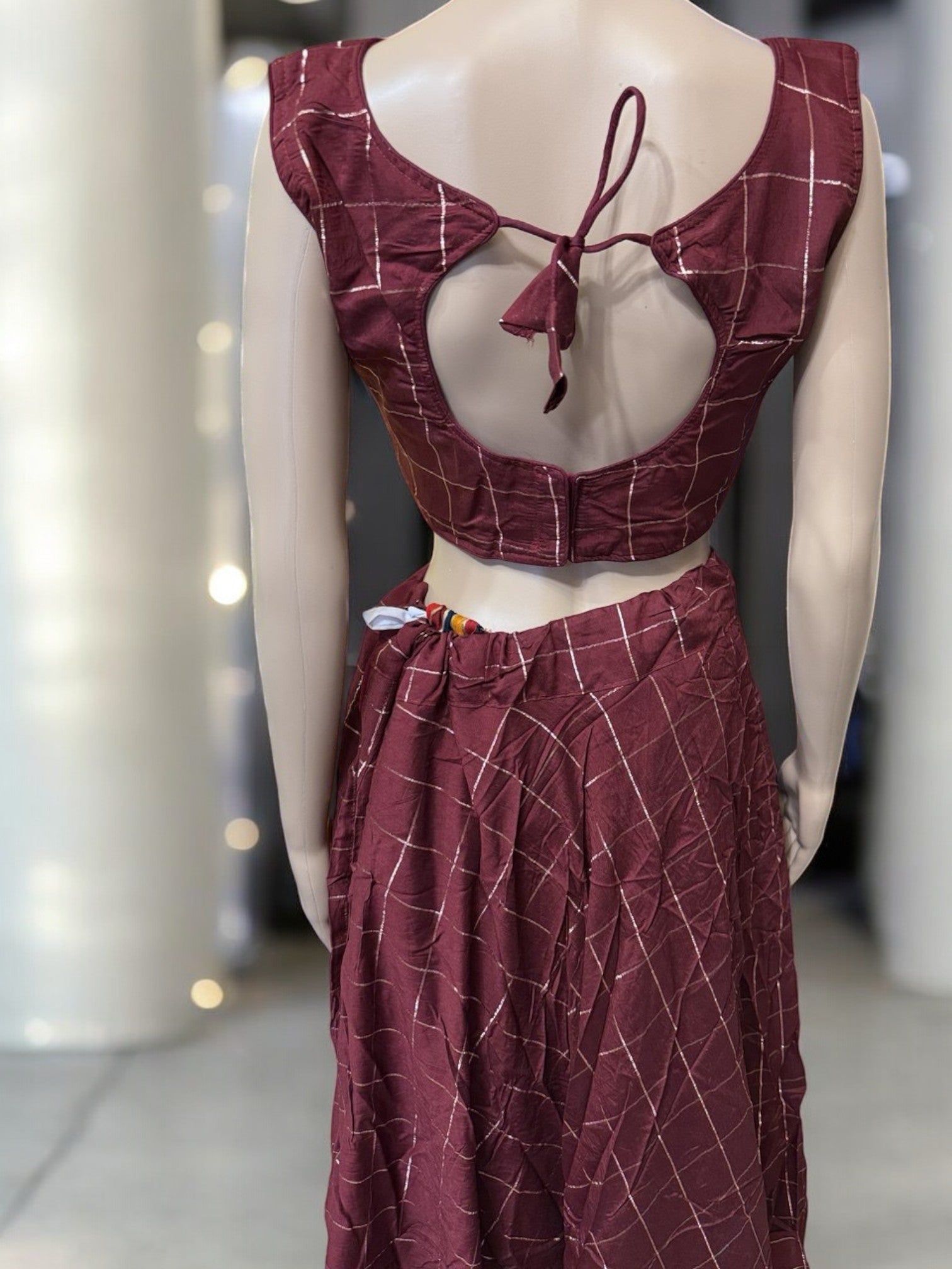 K20 - Maroon Checkered Lehenga Choli Set – Sleeveless Indian Festive Wear for Diwali