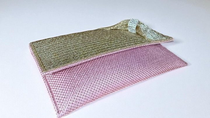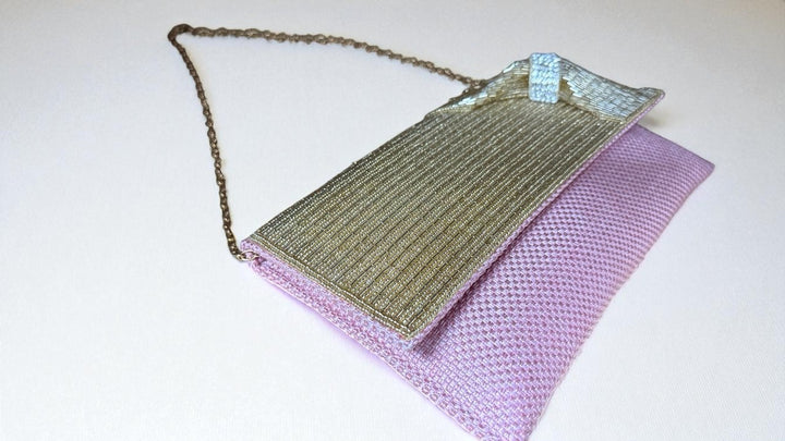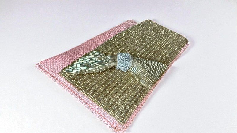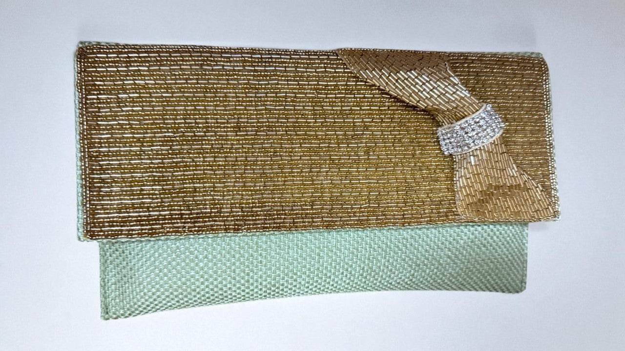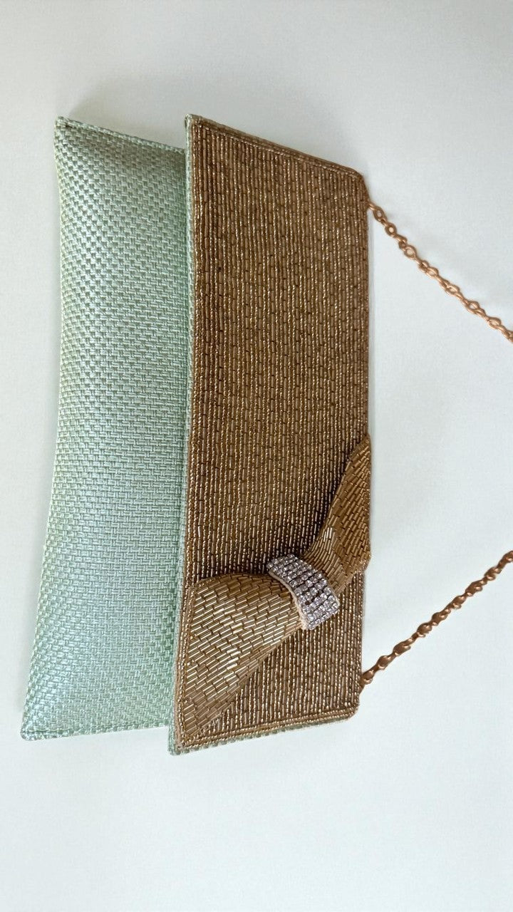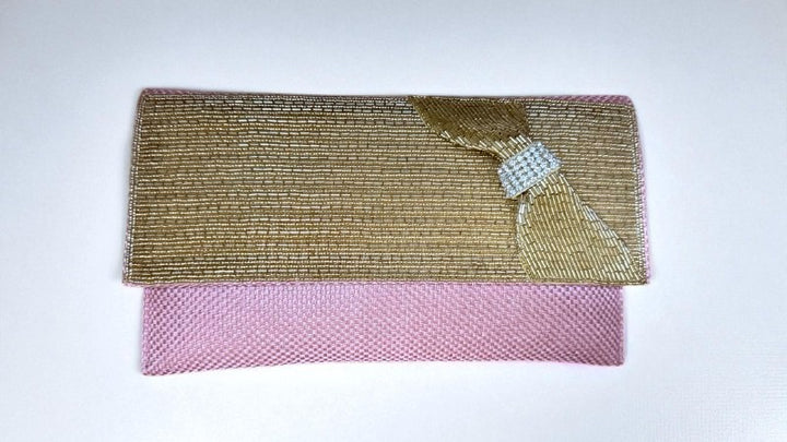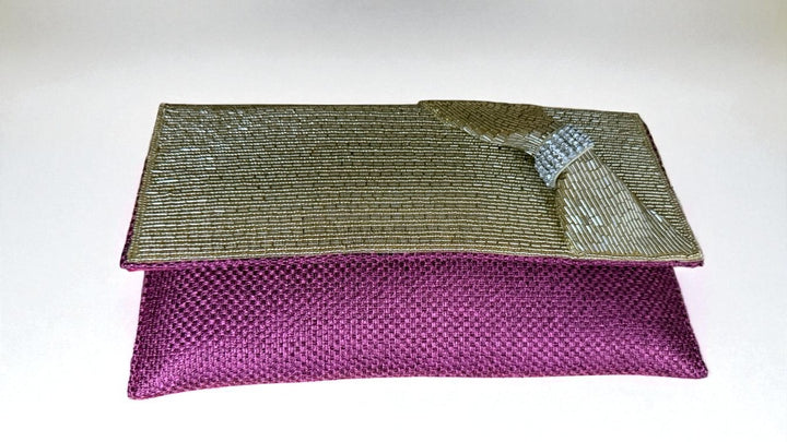 - The Maroon & Gold Bow Clutch pairs rich maroon fabric with a shimmering gold flap, finished with a chic bow and rhinestone detailing. Its dual-tone design makes it the perfect companion for weddings, parties, and celebratory evenings. -