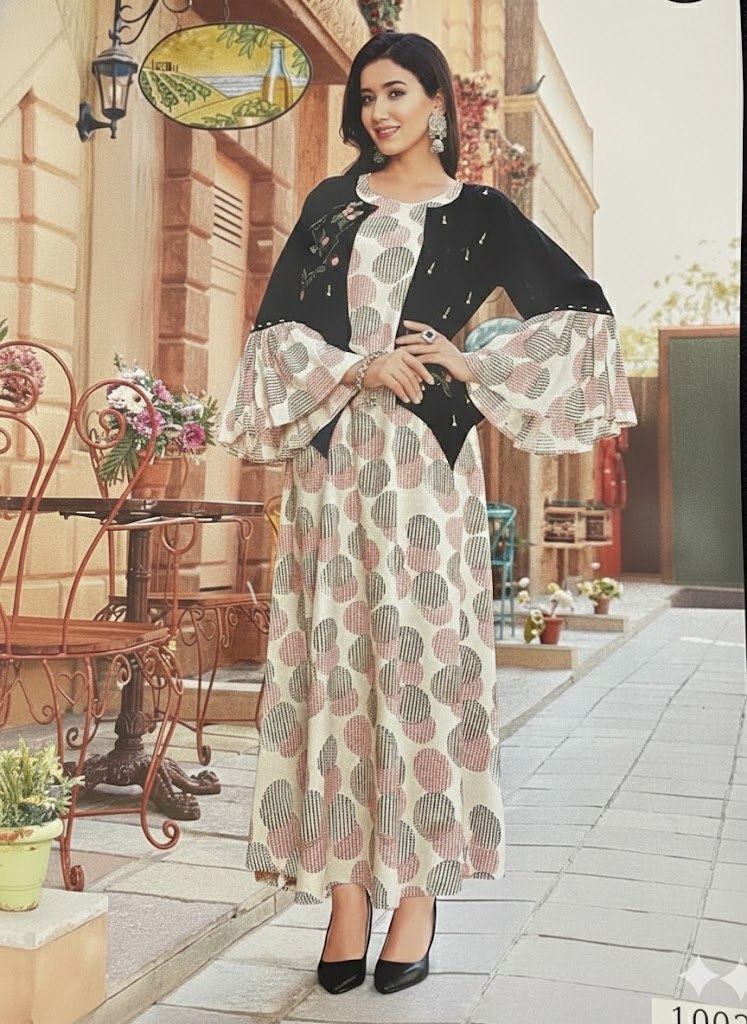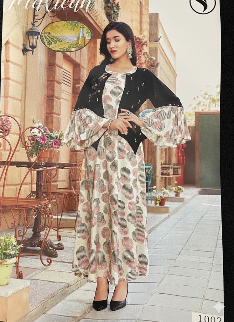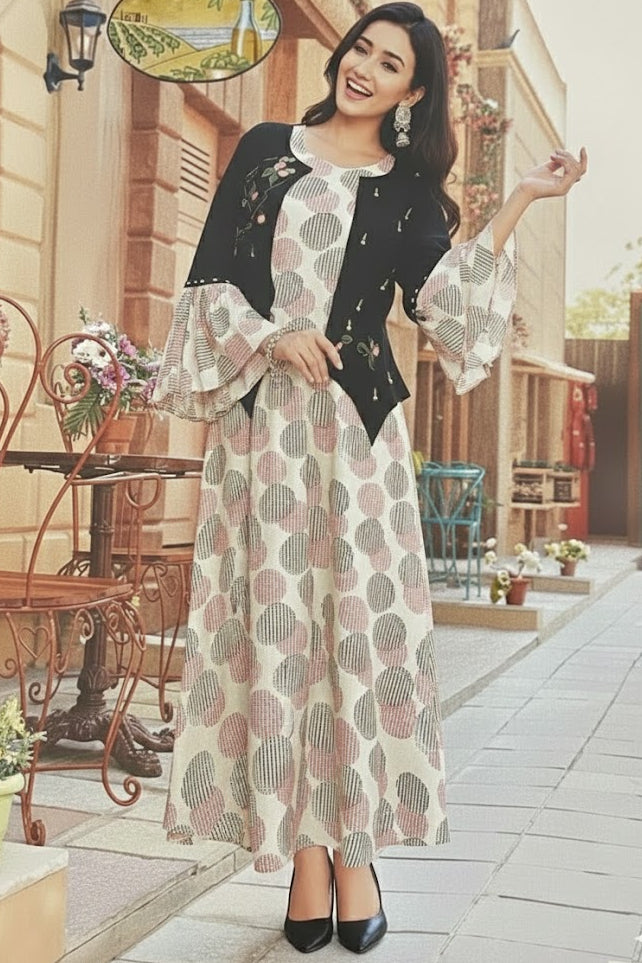 This set is ideal for those who love versatile and stylish outfits. The combination of the printed maxi dress and detachable shrug set ensures you can create different looks. Add this set to your wardrobe for a touch of elegance and versatility. π