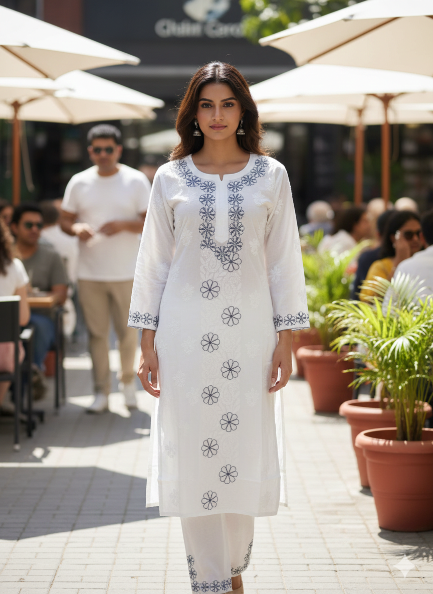 Top68 - 2-Piece Kurti & Pants Set Elegant White Embroidered Kurti