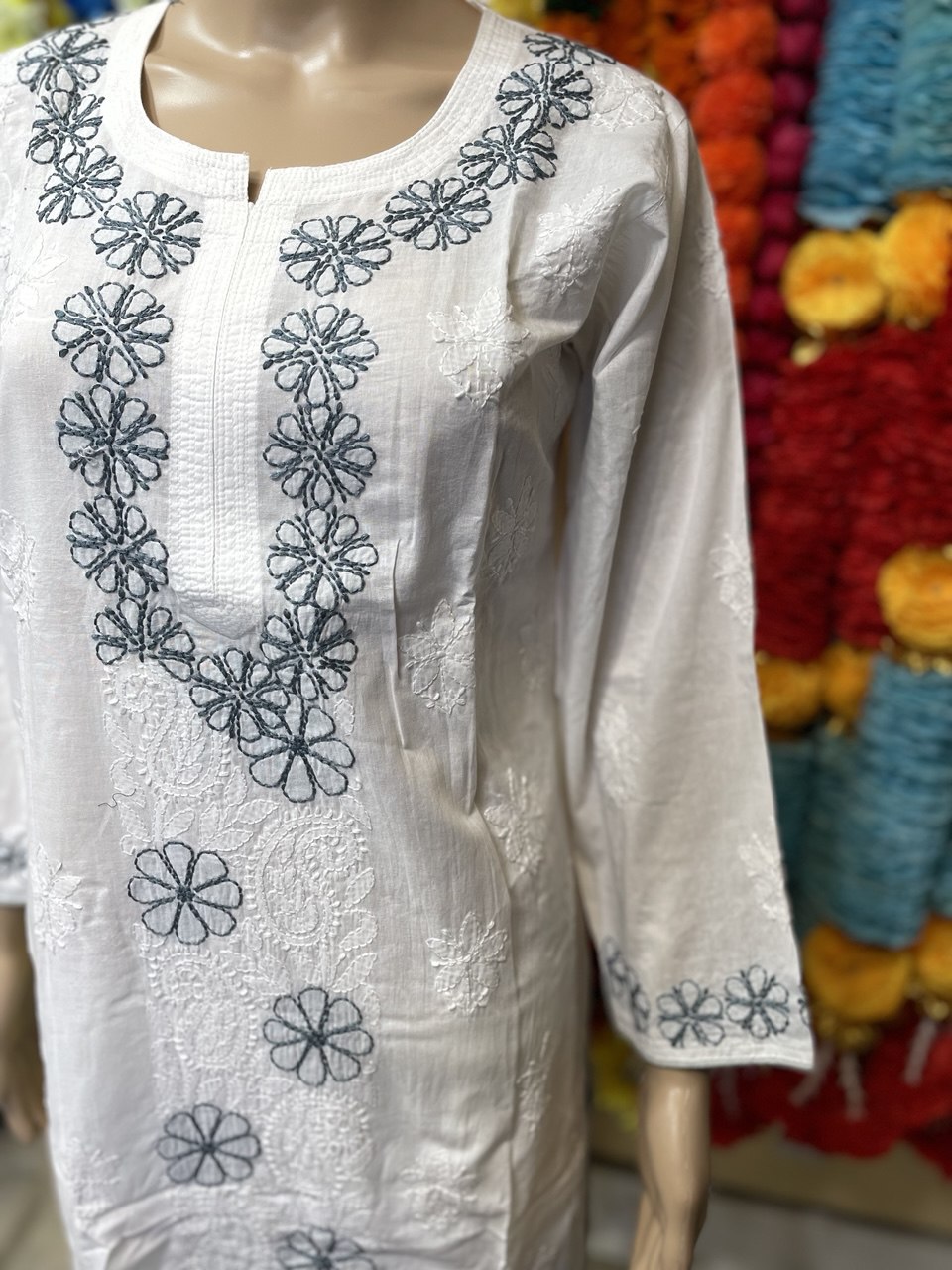 This elegant white embroidered kurti/top with a floral neckline and long sleeves is a must-have for your wardrobe. Available in size 40, it offers both style and comfort. 🌸✨