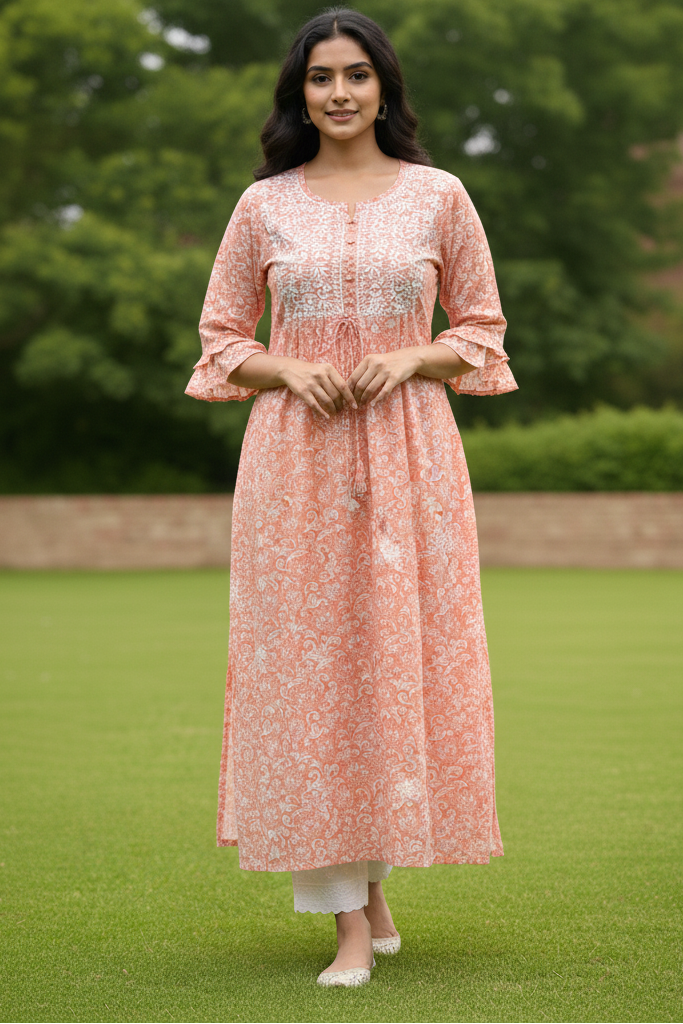 Graceful and timeless, this light Peach ethnic dress is a celebration of soft elegance and traditional motifs. Adorned with delicate white floral and paisley patterns, the design evokes a sense of heritage while maintaining a contemporary silhouette. The empire waistline flatters the figure, while the round neckline and buttoned chest add structure and charm.