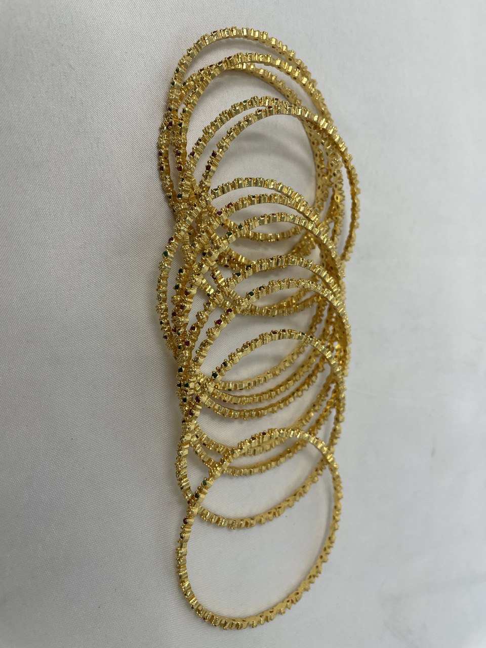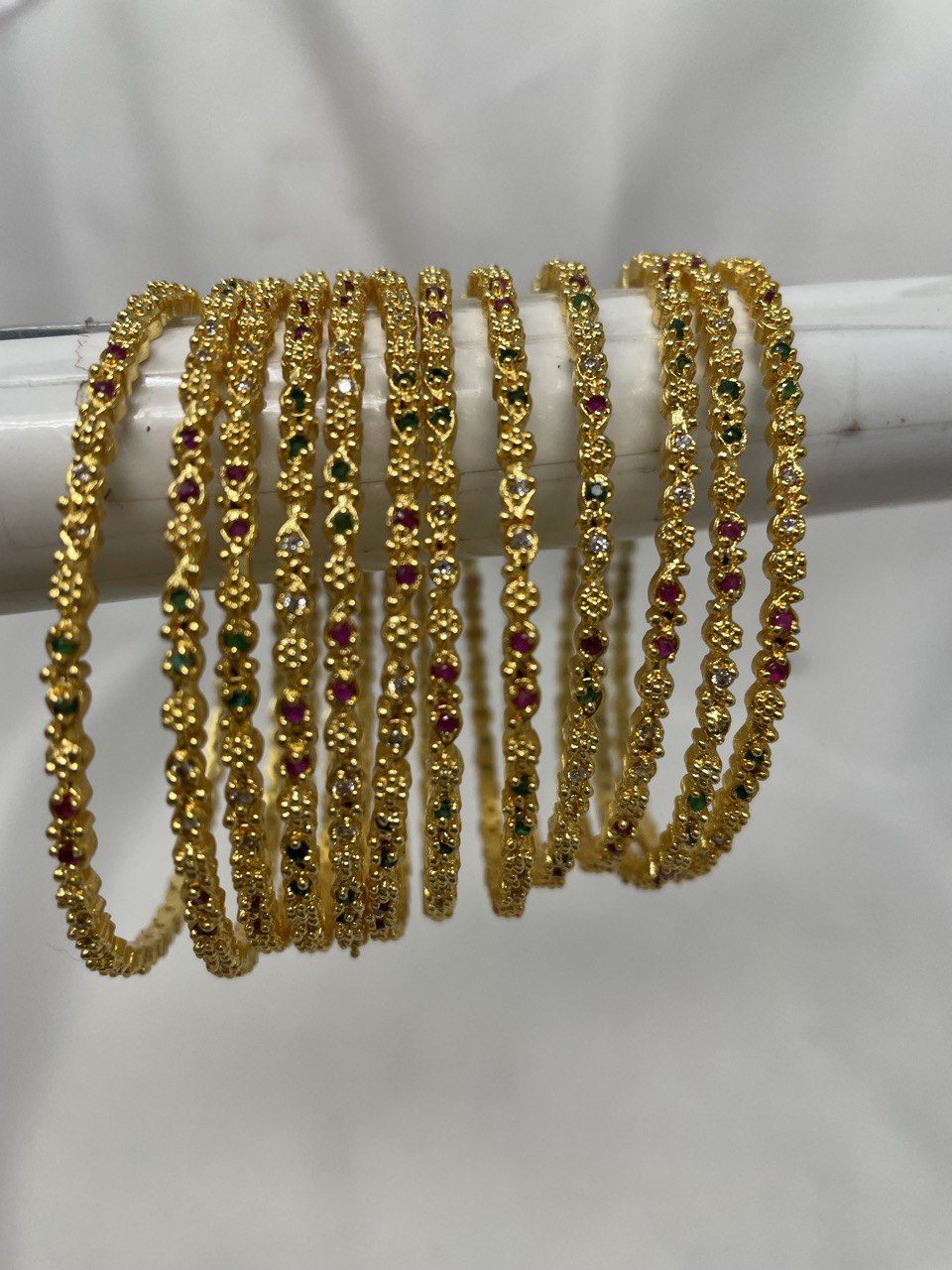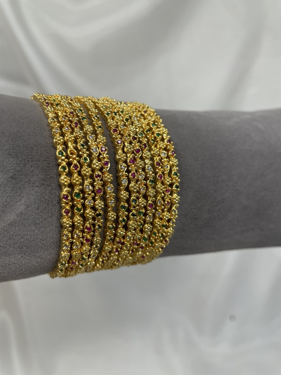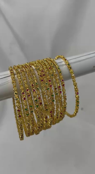 Delicate Multicolor Detailing: Each slender bangle is punctuated with tiny, vibrant ruby red, emerald green, and sparkling clear stones, providing a refined "pop" of color.