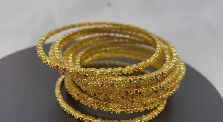 Add a delicate touch of color to your daily grace with this set of gold-plated dainty bangles. Featuring a fine, textured finish and miniature multicolor stone accents, this stack is the perfect blend of subtle elegance and traditional charm.