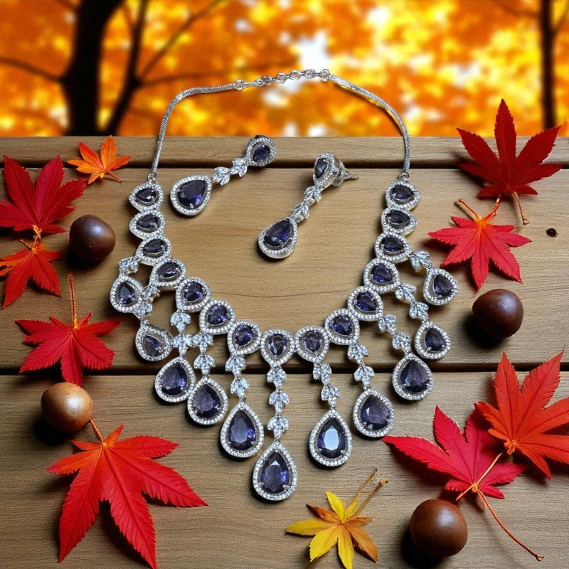 Make a royal statement with this stunning Blue Stone & Silver Necklace Set, complete with matching earrings. Designed with teardrop-shaped Blue stones surrounded by shimmering silver accents, this set exudes elegance and sophistication. The cascading design of the necklace adds a regal charm, making it perfect for bridal wear, weddings, receptions, or festive occasions. The matching earrings beautifully complement the necklace, giving you a complete, graceful look.
