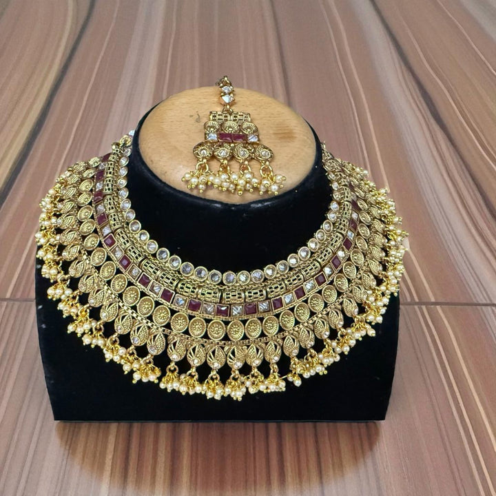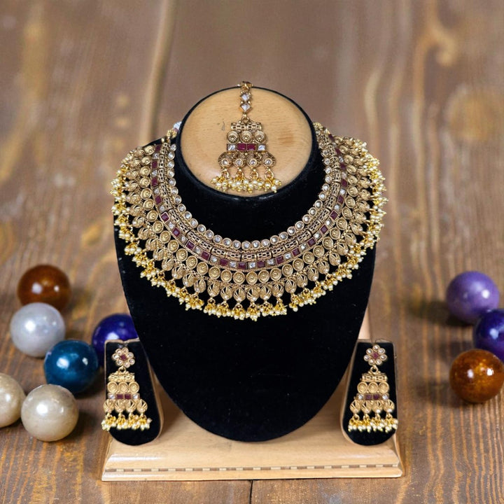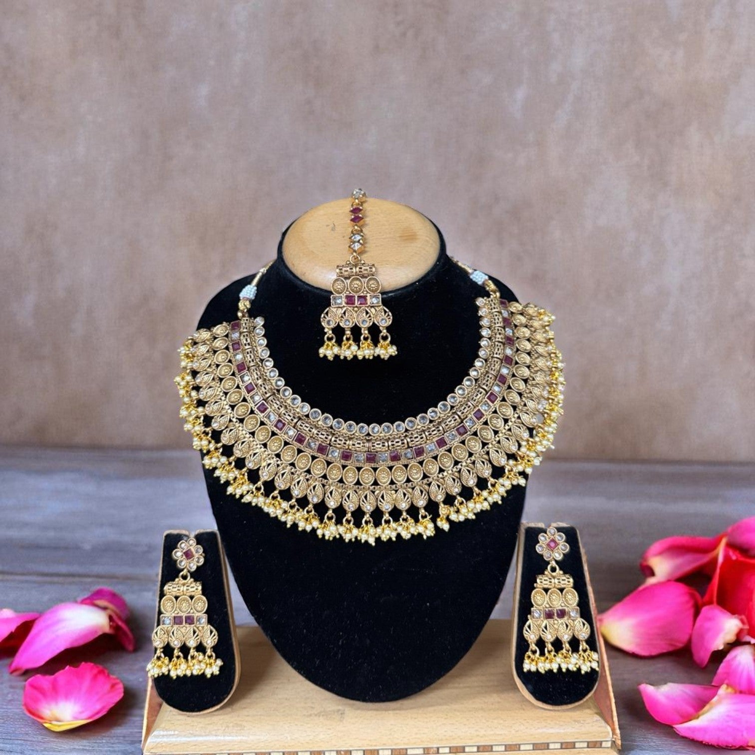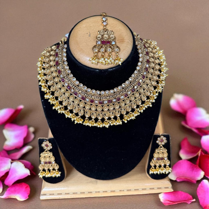 RADK3 - Bridal Jewelry Set Gold-Toned Necklace, Maang Tikka & Earrings with Ruby Stones