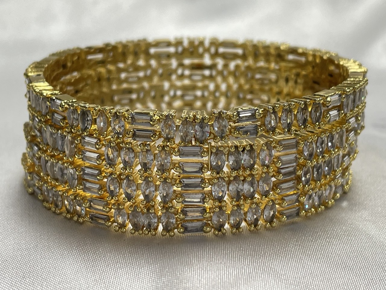 Intricate Multi-Shape Array: Densely encrusted with five sophisticated rows of baguette and marquise-cut American Diamonds, creating a textured, multi-dimensional sparkle.