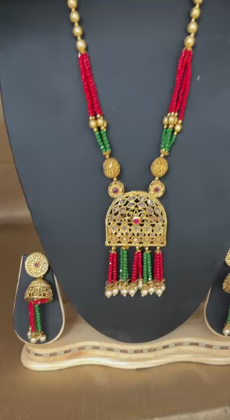 The beaded strands in vibrant red and green, accented with antique gold round beads and textured elements, give it a rich and regal aesthetic. Matching dome-shaped jhumka earrings with bead tassels complete the set for a coordinated ethnic look.