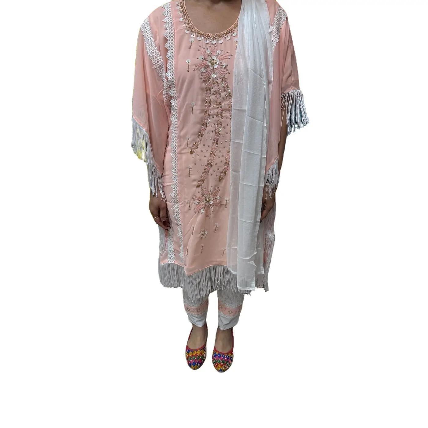 This set is a true masterpiece, featuring intricate embroidery and handwork that showcases the artistry of our skilled craftsmen. The tassel lace detailing adds a touch of whimsy and femininity, making it perfect for any occasion. Made with premium quality fabrics, the kurti and pants are not only comfortable to wear but also exude an air of sophistication.