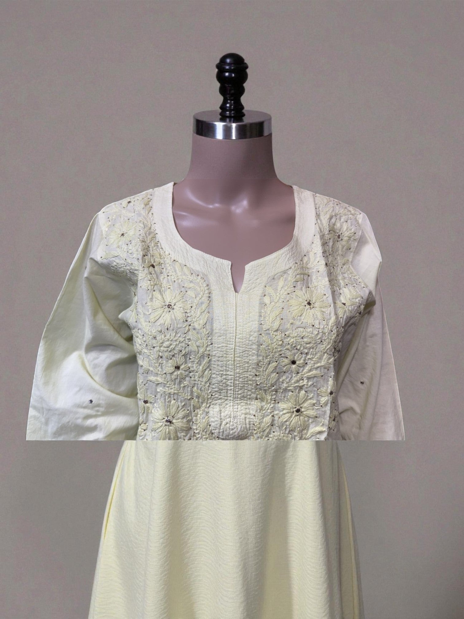 Top22 - Handmade Light Yellow Cotton Kurti Floral Embroidery, Festive Ethnic Wear