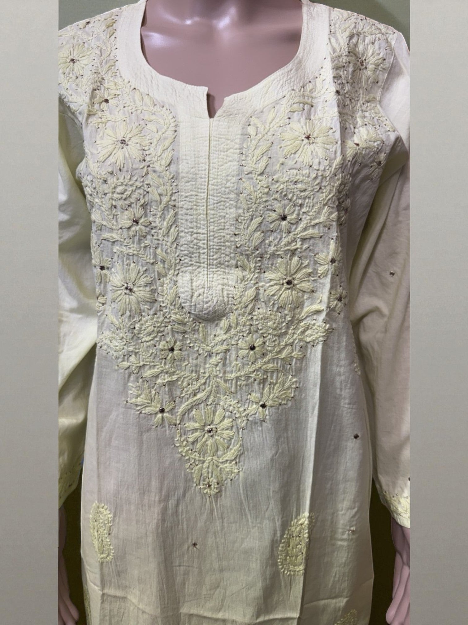 Design No.Top-22Size S (38) Celebrate tradition with a touch of elegance in this handcrafted light yellow kurta. Made from breathable cotton, this long-sleeved tunic features intricate tone-on-tone embroidery in a symmetrical...