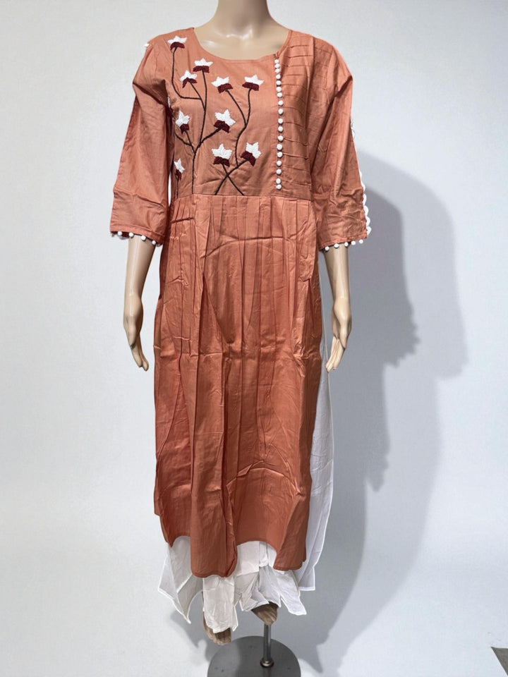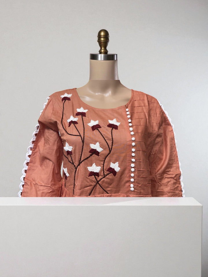 Top23 - Rust Orange Kurti with Floral Embroidery