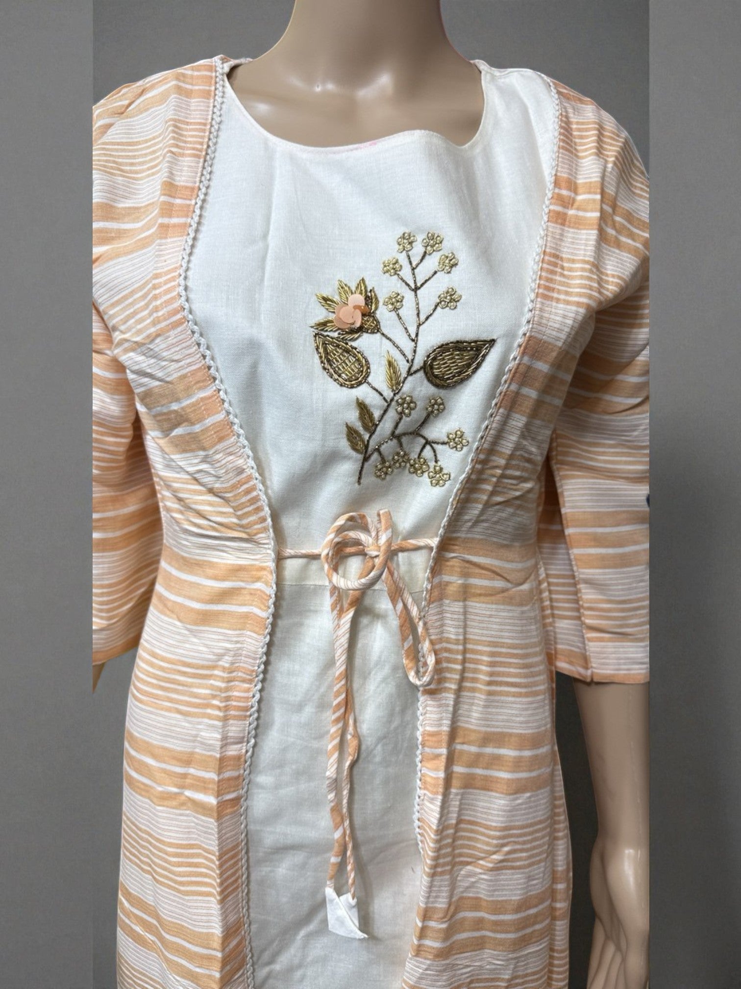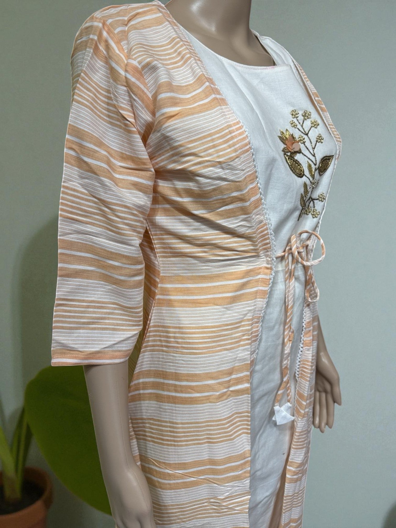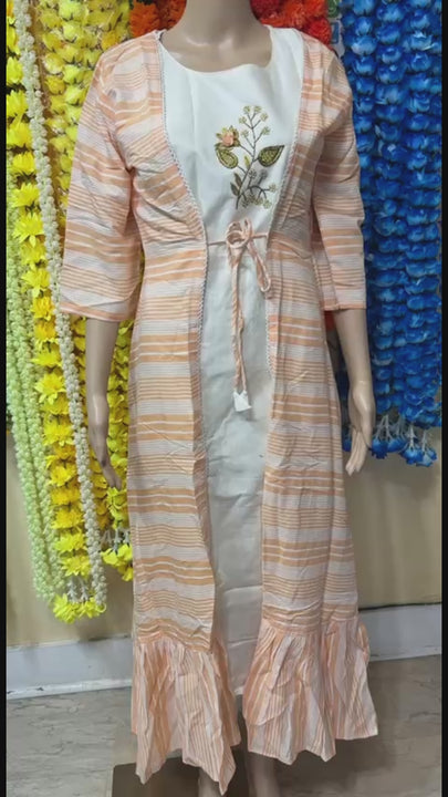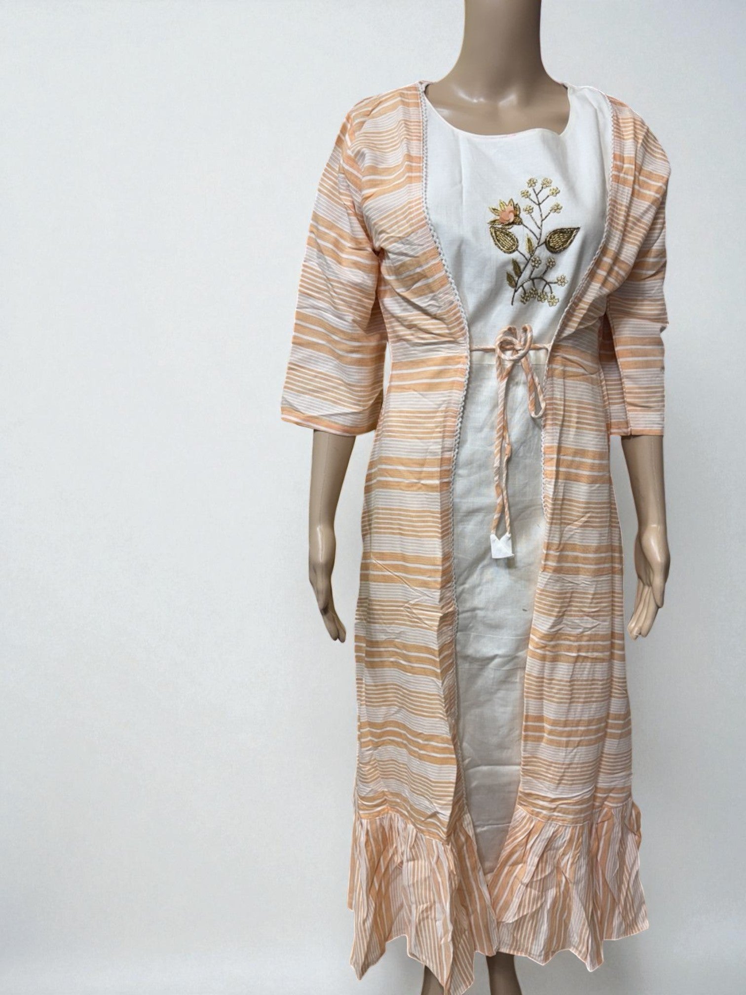 Celebrate the fusion of tradition and modern flair with this layered peach and white striped dress. Featuring a floral embroidered white inner and a breezy striped overlay, this ensemble is perfect for festive occasions and stylish daywear.